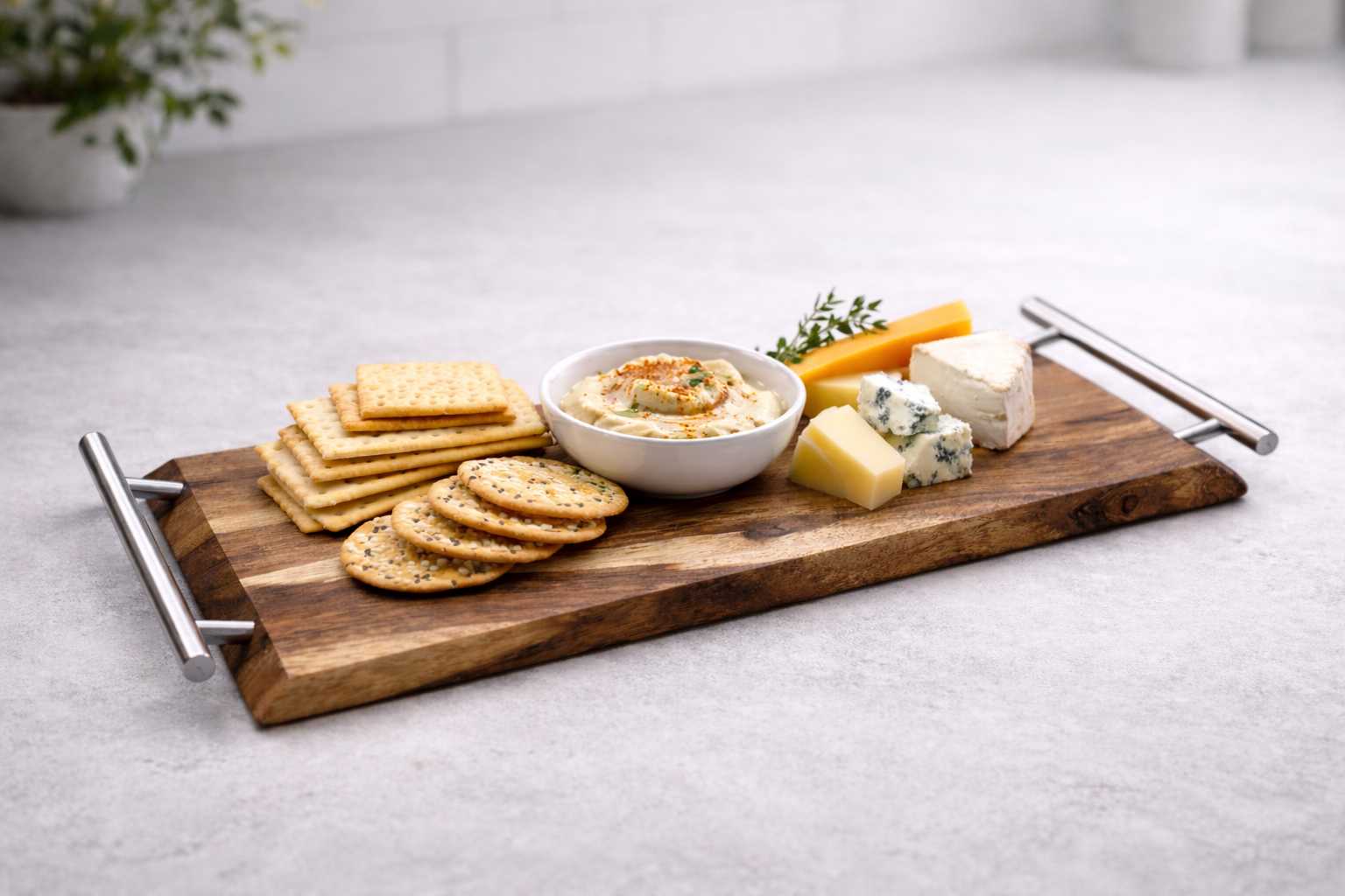 The Kiaat hardwood tray with handles is a perfect example of this natural beauty. Its unique features include the two stainless steel handles angled at 45 degrees, which make it easy to carry, and its smooth, buffed surface.