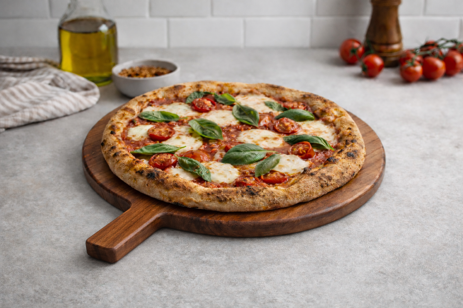 Teak 33cm round pizza paddle board with handle (43cm including handle)